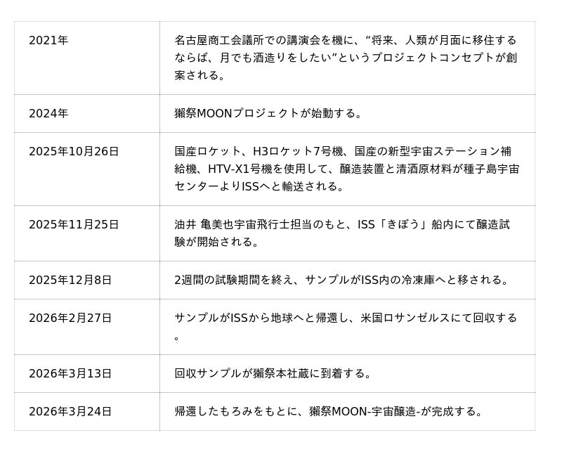 株式会社獺祭(本社:山口県岩国市、以下、獺祭)と三菱重工業株式会社(本社:東京都千代田区、以下、三菱重工)は、月面での清酒製造を目指す「獺祭MOONプロジェクト」の第一弾ミッションを完遂しました。本ミッションは、獺祭と三菱重工が共同開発した専用の醸造装置と清酒の原材料を国際宇宙ステーション(ISS)へ打上げ、ISS「きぼう」日本実験棟のJAXAの実験装置内部で月面重力を模擬した環境において、人類史上初となる清酒のアルコール発酵過程を確認することに成功しました。ISS「きぼう」船内で発酵を終えたもろみは、地球へ帰還し、今年3月に獺祭の本社蔵にて清酒へ仕上げられ、予定していた「獺祭MOONプロジェクト」第一弾ミッションは全て完了しました。
