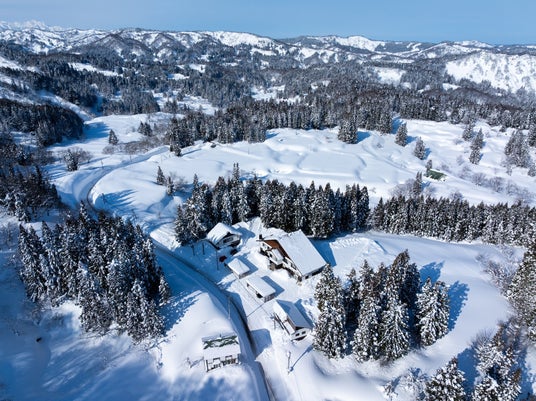 雪と里山醸造所の上空写真(左側の小さな建物が蔵、右隣は酒の宿玉城屋グループ経営のHotel 醸す森:代表 山岸裕一)
