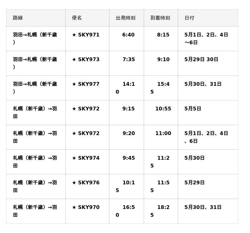 ■2026年5月/6月『羽田=札幌(新千歳)』線、『札幌(新千歳)=羽田』線臨時便一覧