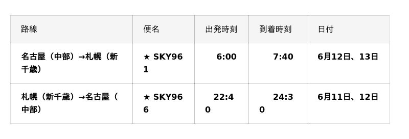 ■2026年5月/6月『名古屋(中部)=札幌(新千歳)』線、『札幌(新千歳)=名古屋(中部)』線臨時便一覧