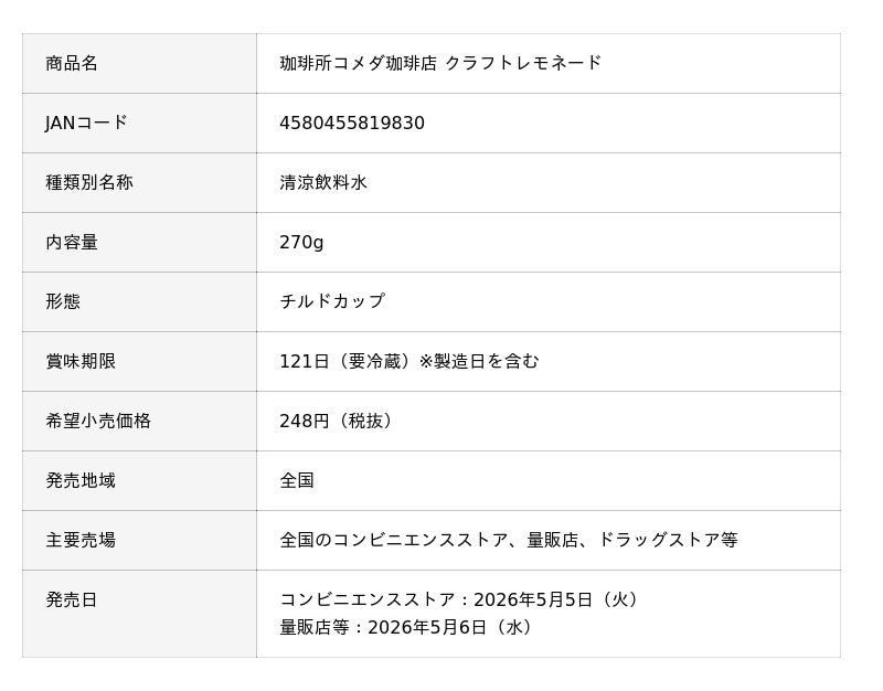 トーヨービバレッジ株式会社(本社:東京都渋谷区、代表取締役社長:熊谷聡)は、株式会社コメダ(本社:愛知県名古屋市、代表取締役社長:甘利祐一)と共同開発した「珈琲所コメダ珈琲店 クラフトレモネード」を2026年5月5日(火)より全国のコンビニエンスストア、5月6日(水)より量販店等にて順次発売致します(一部地域・一部店舗を除く)。