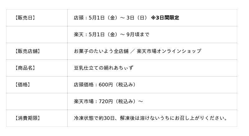 株式会社太陽社(所在地:千葉県匝瑳市飯倉293、代表取締役:片岡正裕)が展開する千葉県で長年愛される菓子店「お菓子のたいよう」は、ゴールデンウィーク期間限定スイーツとして、「豆乳仕立ての絹れあちぃず」を5月1日(金) ~ 3日(日)の3日間限定で販売いたします。
