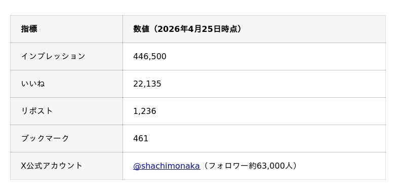 2026年4月19日(日)9:17、X公式アカウント(@shachimonaka)に「新商品『ひとりじめショートケーキ』」と投稿しました。4月25日時点の数値は以下のとおりです。