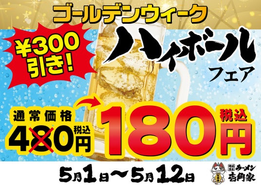 株式会社ガーデン(本社:東京都新宿区 代表取締役社長:川島賢 以下「当社」)が運営する「壱角家」は、ゴールデンウィーク期間の外食機会が増える時期にあわせハイボールフェアを延長し、2026年5月1日(金)~12日(火)の期間限定で、通常480円(税込)でご提供しているハイボールを300円引きの180円(税込)で楽しめるゴールデンウィークハイボールフェアを開催いたします。