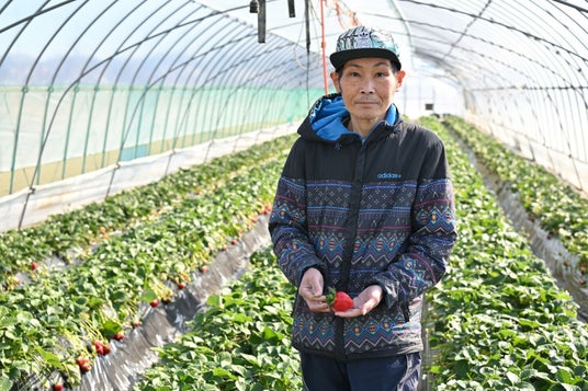 1970年創業の水野農園の三代目水野陽さんは、「愛と手」をかけるいちごづくりを信条に、いちご一粒一粒と向き合い続けています。