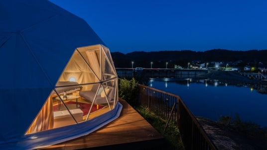 glampark 亀山温泉 亀山湖の絶景を望むレイクサイドグランピング。夜は静かな湖畔で非日常の時間を