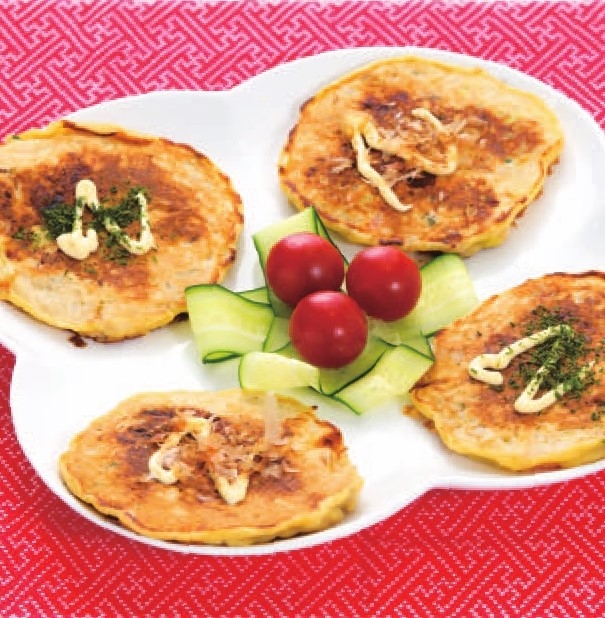 - マヨネーズ、かつお節、青のりをかける。