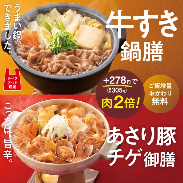 株式会社吉野家(代表取締役社長 河村泰貴、本社:東京都中央区 以下吉野家)は、2013 年以降毎年リピート率が非常に高い大人気商品『牛すき鍋膳』648 円(税込 712 円)と、吉野家初の海鮮鍋となる『あさり豚チゲ御膳』648 円(税込 712 円)を全国の吉野家店舗*で 10 月 21 日(木)11 時から販売を開始します。両商品ともご飯増量・おかわりともに無料、テイクアウトでもご利用いただけます。