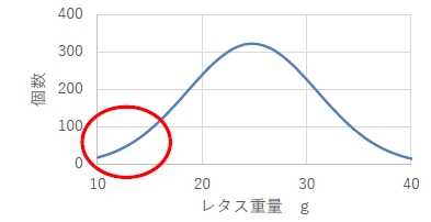 図1 実際の植物工場で栽培中のレタスの重量分布例