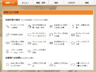 ユーザーが安心できる飲食店選びをサポートし飲食店への送客につなげるため、2020年7月より「ぐるなび」サイト上の店舗ページでは、飲食店が実施している新型コロナウイルス感染症対策を表示しています。2021年12月からは「全スタッフワクチン接種済」の表示を追加し、全18項目の新型コロナウイルス感染症対策を表示することが可能になりました。
