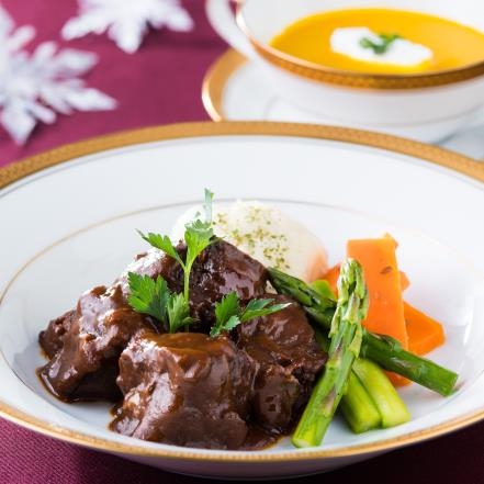 この商品は、好評シリーズの機内食セット第 5 弾で、今回は完全予約制の初のビジネスクラス商品です。「空の旅をおウチで楽しむ。」のテーマに沿って、和・洋・中の 3 種類を今後順次ラインアップ予定で、今回は洋食セットをご用意しました。セット内容はお二人様用で、メインディッシュ、スープ、デザートのコースをお楽しみいただけます。シェフ渾身のメインディッシュ「牛ほほ肉の赤ワイン煮」の味をご堪能いただき、「パンプキンスープ」で甘みとコクの優しい味わいを、そして、サクサク食感で口いっぱいに紅茶の香りが広がる「アールグレイアップルパイ」をお楽しみいただけます。