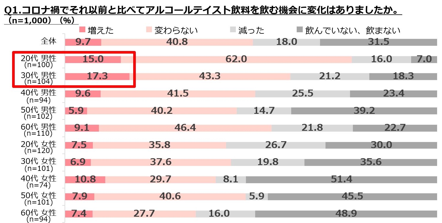 ・コロナ前と比べて飲む機会が増えた人は約1割、特に20~30代の男性でやや高め。
