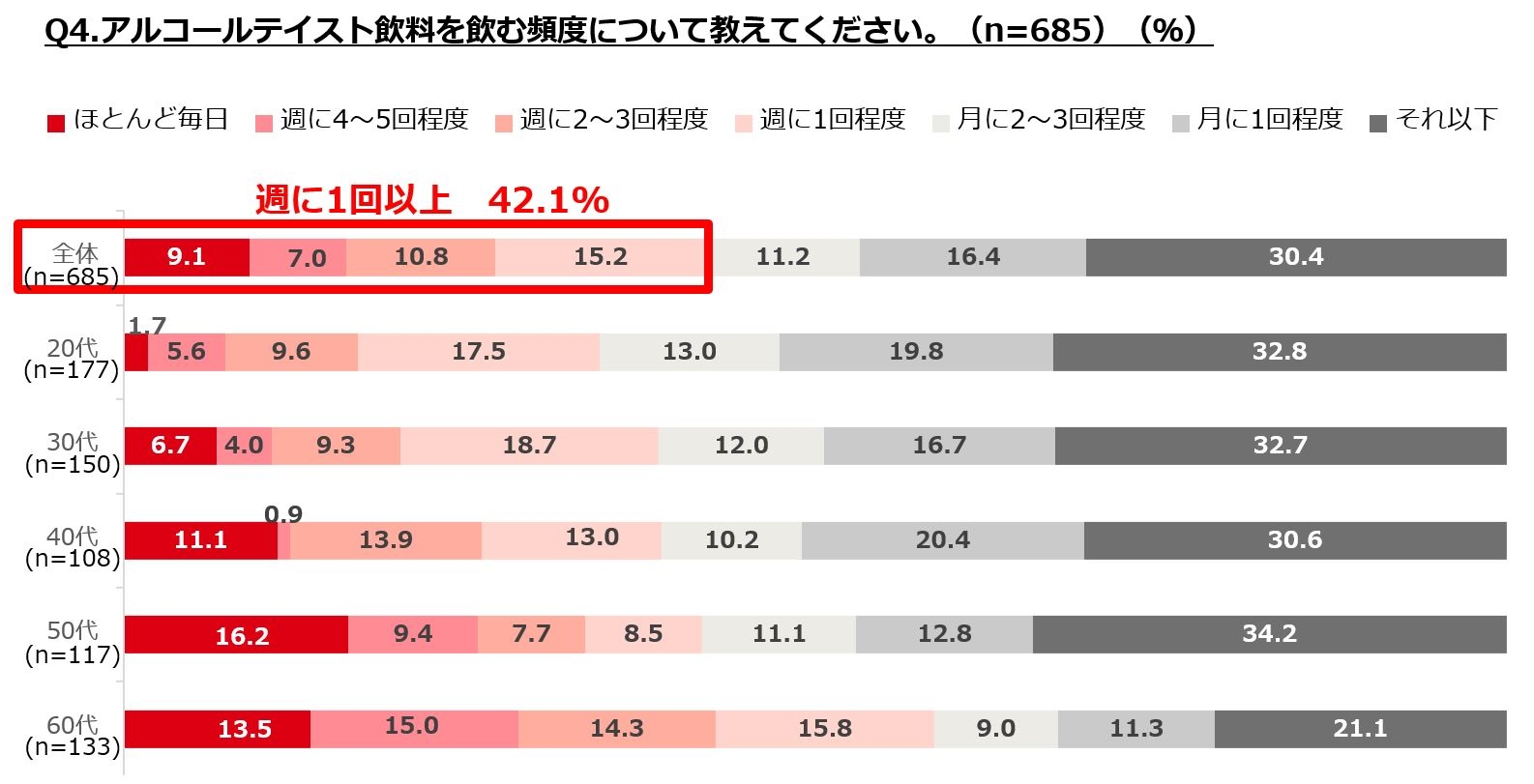 ・週に1回以上飲む人が4割強で、年代が上がるほど頻度も増加傾向。
