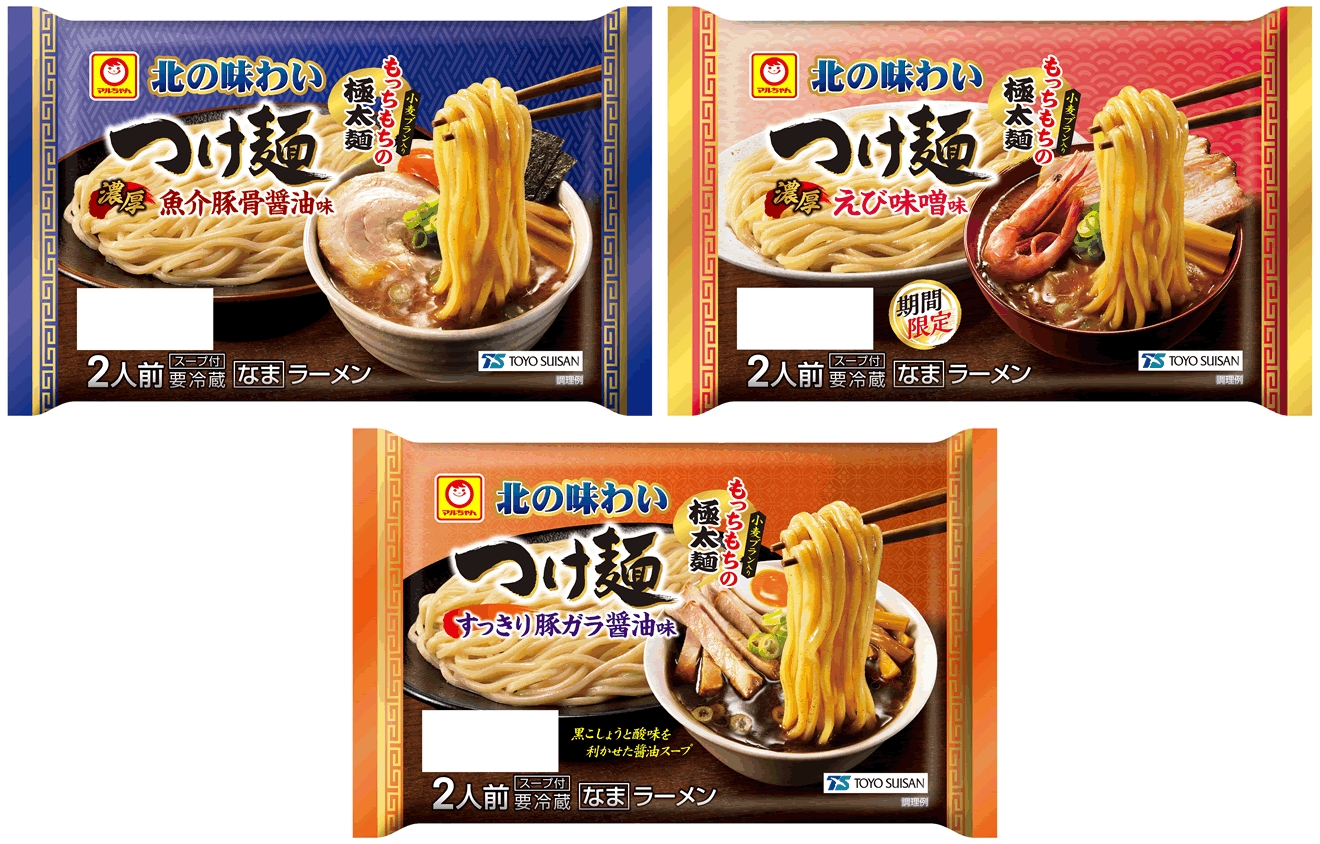 東洋水産株式会社(本社:東京、社長:今村 将也)では、2022年2月14日(月)より全国にて、チルド麺「マルちゃん 北の味わい つけ麺 濃厚魚介豚骨醤油味 2人前」「同 濃厚えび味噌味 2人前」をリニューアル発売し、「同 すっきり豚ガラ醤油味 2人前」を新発売致します。