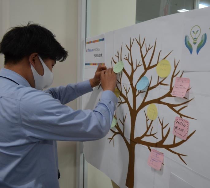 ▲開催場所に「SDGsの木」を設置。「食べ残しをしない」「ゴミを削減する」等、従業員それぞれのSDGsへの取り組みや決意表明を記入しました。