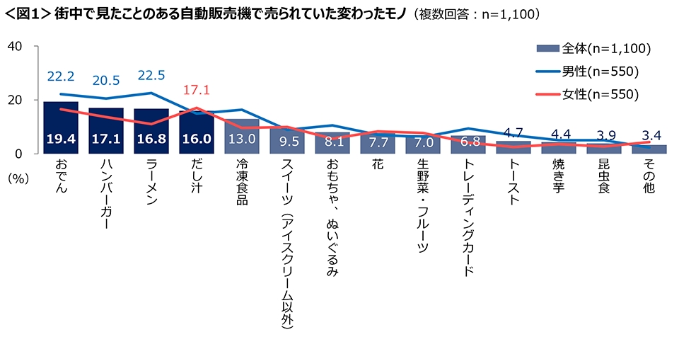 ◆見たことのある変わりダネ自動販売機は「おでん」「ハンバーガー」「ラーメン」「だし汁」などの飲食系が上位にあがっている。