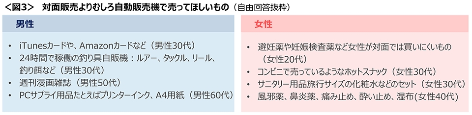◆対面販売より、むしろ自動販売機で買いたいものは、医薬品やコンビニのホットスナック、iTunesカードやAmazonカード、週刊漫画雑誌などの声があった。<図3>