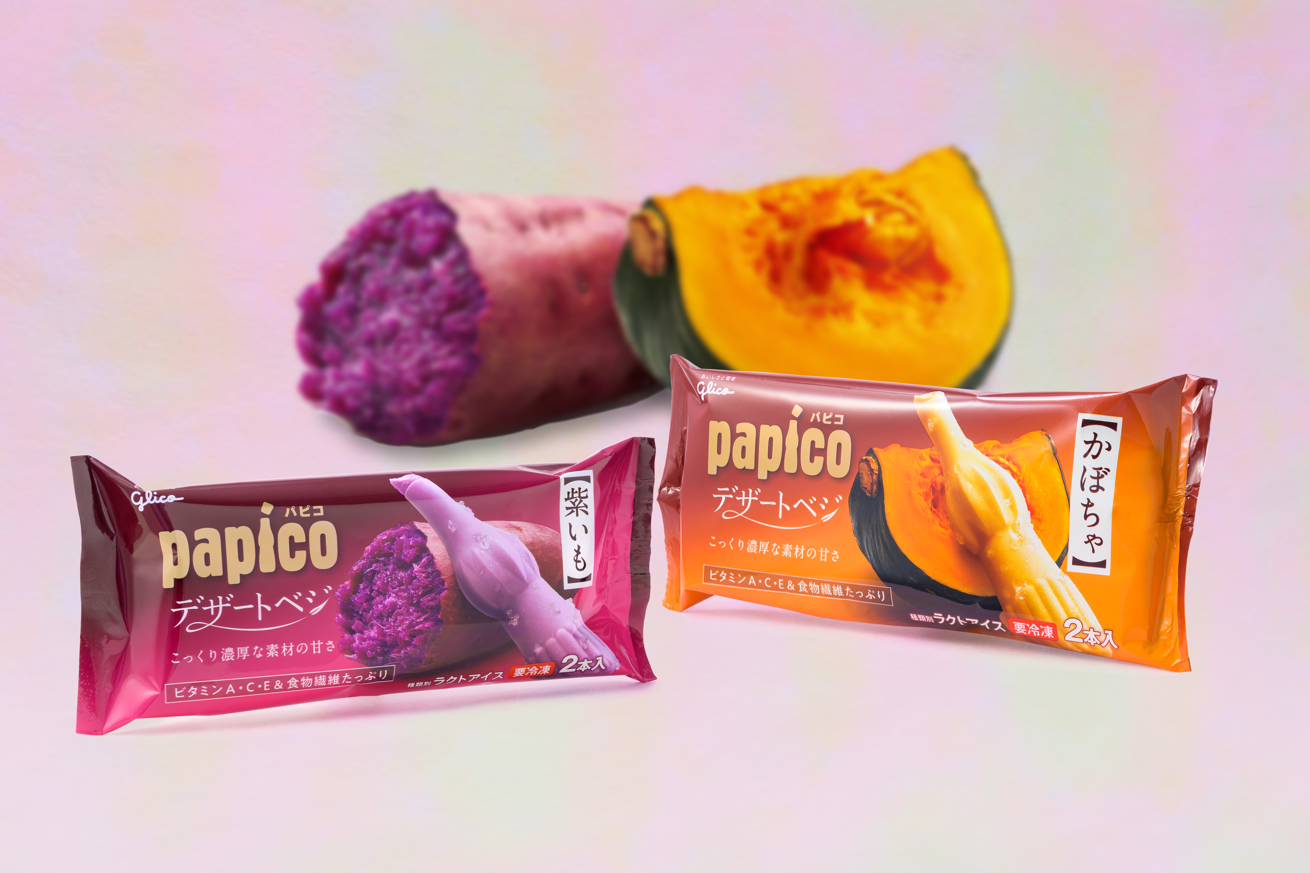江崎グリコ株式会社は、なめらかな食感が特長のロングセラー商品「パピコ」の新シリーズとして、「パピコ デザートベジ<紫いも>」「パピコ デザートベジ<かぼちゃ>」の2品を、2022年4月4日(月)より全国にて発売します。
