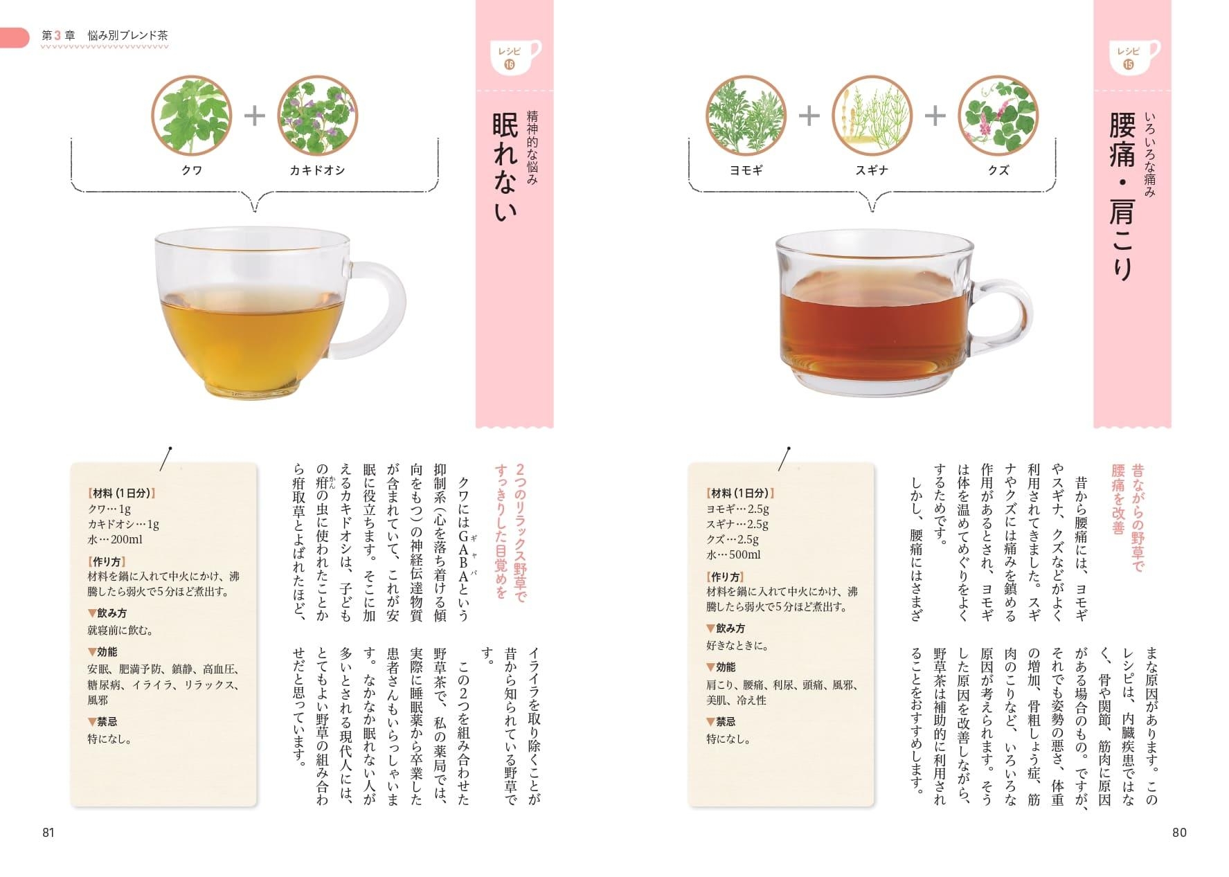 『薬学博士が教える 手づくり野草茶レシピ』では、タンポポやスギナ、カキの葉といった公園や河原で採集できる植物から、クロモジやクコといった少し珍しい種類まで、さまざまな野草を使ったお茶のレシピ計63種類を、大きなイラストと効能の解説とともに紹介します。