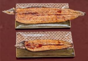 上:今回生産した2倍サイズのうなぎ、下:通常サイズのうなぎ