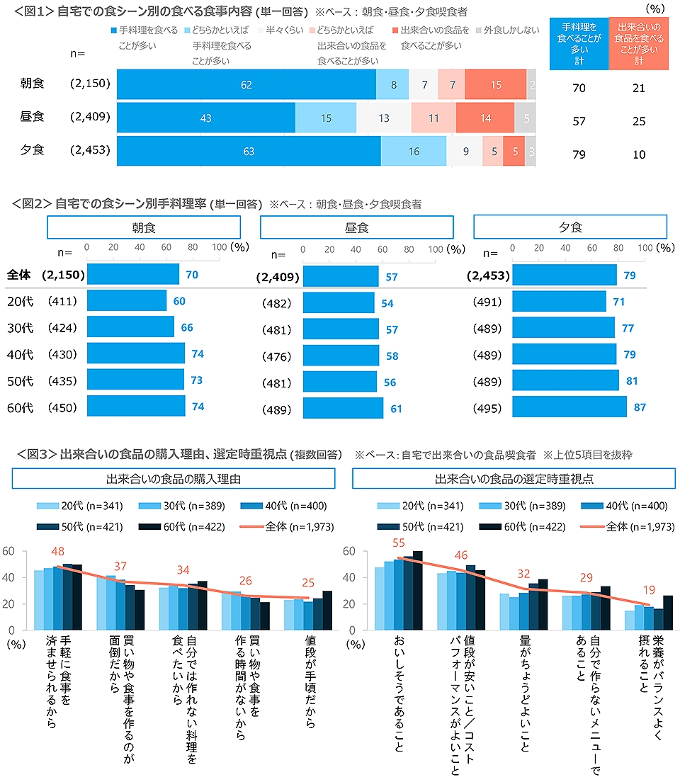 朝食、昼食、夕食ごとに自宅で食事をする際の“手料理”と“出来合いの食品を食べる”頻度を聴取した結果、三食ともに“手料理”をしている割合が最も高かった。特に夕食の手料理率は79%を占めた。手料理率は年代が高いほど高まる傾向にある。昼食は“出来合いの食品を食べる”と“外食”するケースが朝食や夕食よりやや多い。<図1,2>
