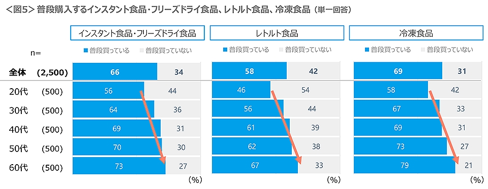 時短料理のレトルトやインスタント、冷凍食品の購入は20代で低め