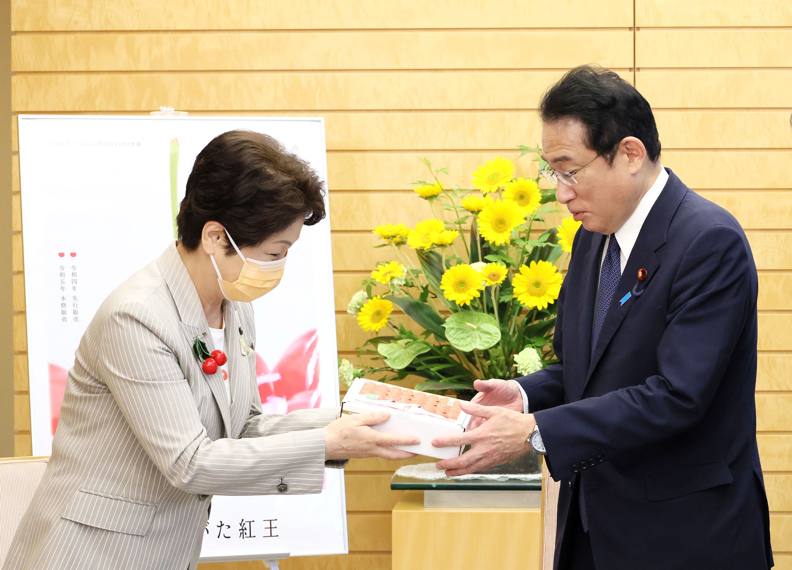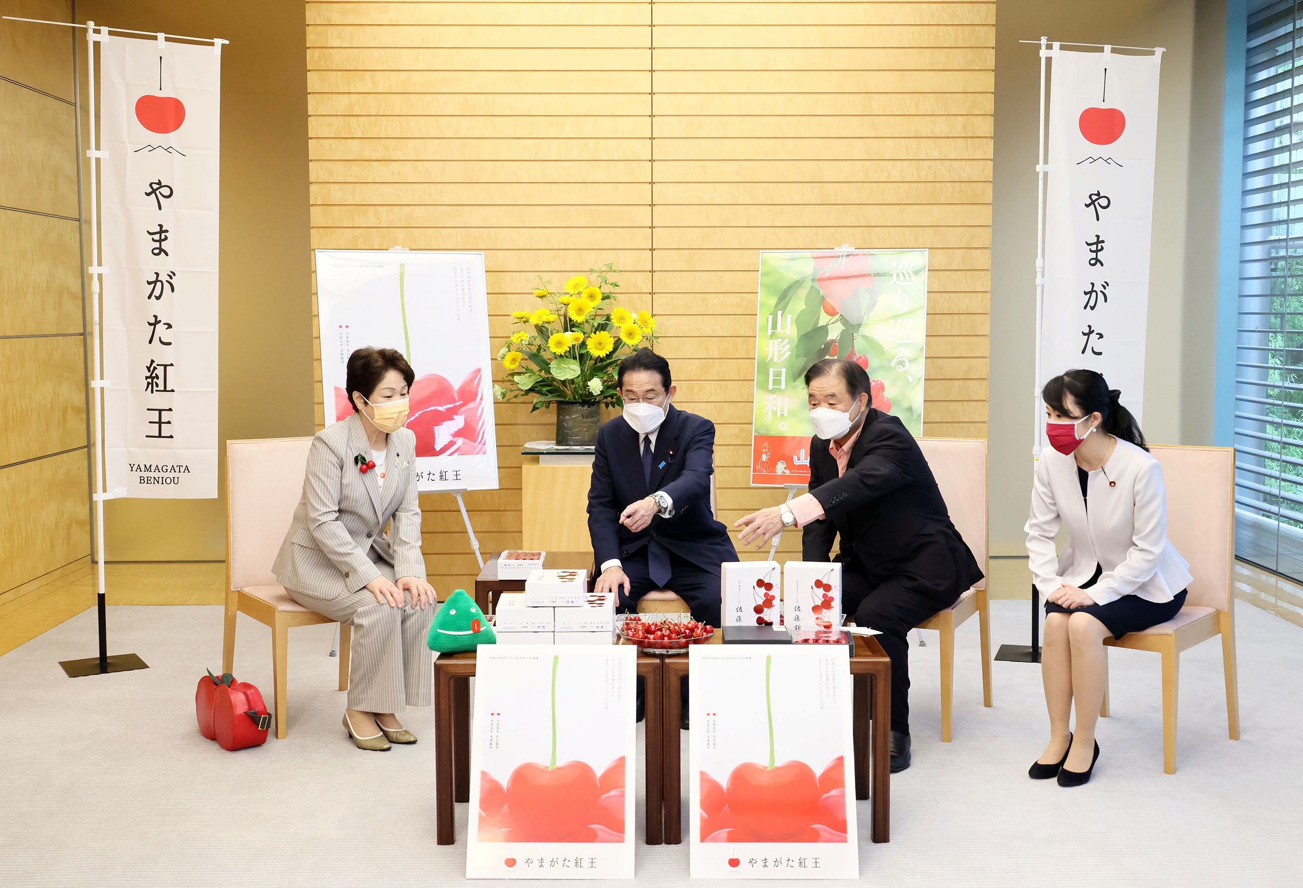 贈呈を受ける岸田総理1 贈呈を受ける岸田総理2 贈呈を受ける岸田総理3 贈呈を受ける岸田総理4 贈呈を受ける岸田総理5 贈呈を受ける岸田総理6令和4年6月16日、岸田総理は、総理大臣官邸で山形県の吉村美栄子(みえこ)知事よりさくらんぼの贈呈を受けました。