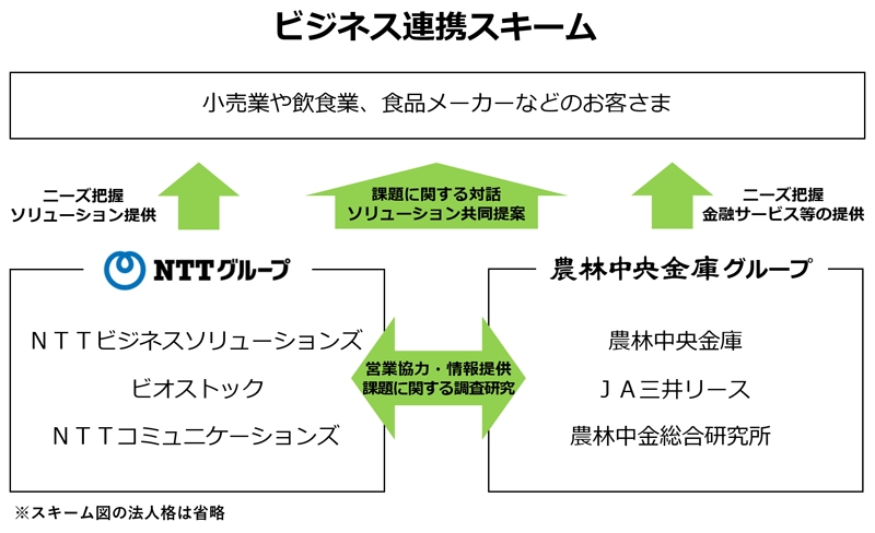 このたび、本課題の解決・食品廃棄コストの削減をめざし、NTTグループの知見・ソリューションと、農林水産業を事業基盤とする農林中央金庫グループの投融資先や系統団体とのネットワーク・調査研究機能・金融サービス提供機能(リース、ファイナンス等)を活かした以下の連携を開始します。