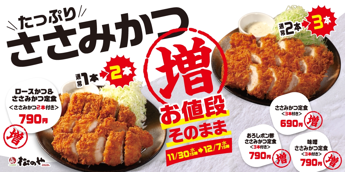 松のや・松乃家にて、2022年11月30日(水)午後3時より、「ささみかつ増量フェア」を開催いたします。