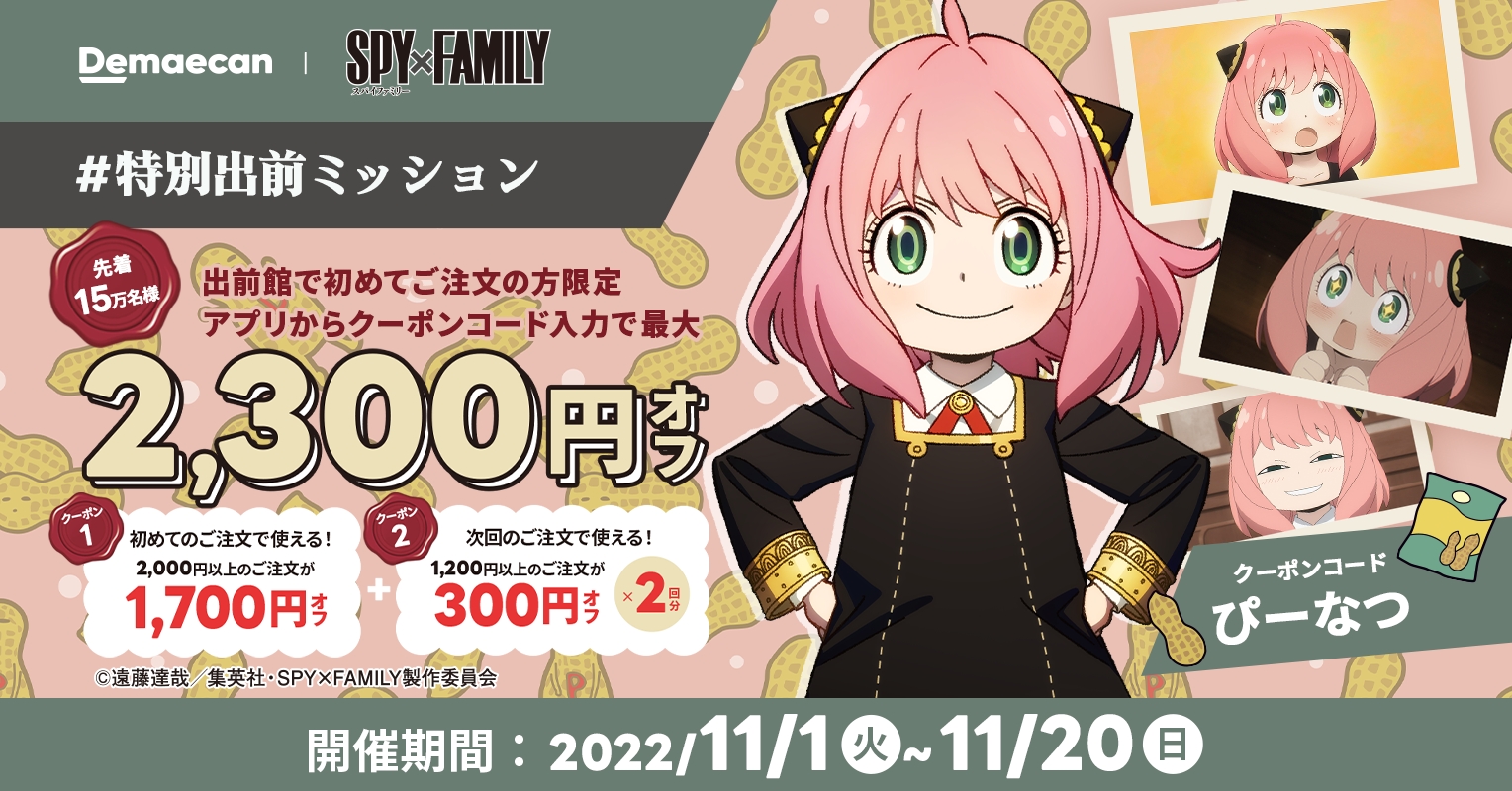 日本最大級のデリバリーサービス『出前館』(運営:株式会社出前館)は、2022年にTVアニメ化され、第2クールも絶賛放送中の大人気TVアニメ「SPY×FAMILY」と2022年11月1日(火)よりコラボキャンペーンを開催いたします。