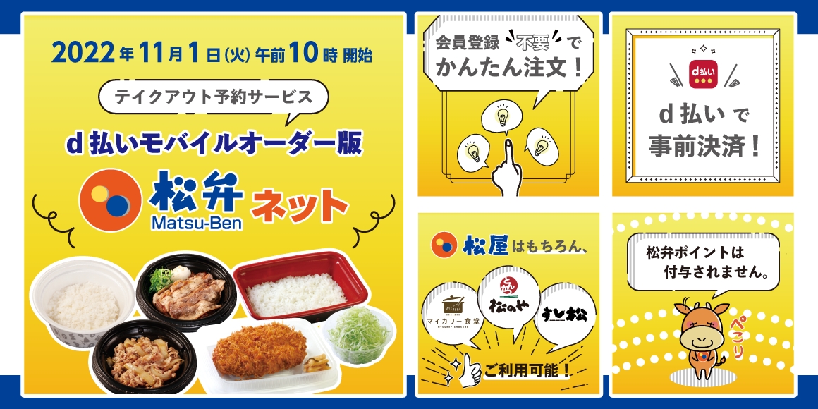 松屋フーズにて、牛めし・カレー・定食・その他丼の「松屋」、とんかつ専門店の「松のや」、その他ブランドにおきまして、2022年11月1日(火)午前10時より、QRコード決済サービス「d払い」のアプリ内から、テイクアウト予約サービス「松弁ネット」を簡単にご利用いただける「松弁ネットd払いモバイルオーダー版」(※1)の提供を開始いたしますのでお知らせいたします。