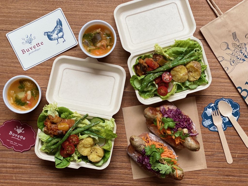 ニューヨーク発祥の朝から夜までオールデイで愉しめるフレンチ食堂、「Buvette(ブヴェット)」の東京店(東京ミッドタウン日比谷1 階)では、テイクアウトでしか召し上がれない自家製ソーセージ、ブレッドを使ったジューシーでボリュームたっぷりのホットドック、秋野菜を使ったスープやシェフズサラダなど、秋の旬を満喫できるメニューで構成したテイクアウト限定ミールボックス「秋のテイクアウトセット」(2人前/税込5,400円)を、事前のご予約限定にて販売します。