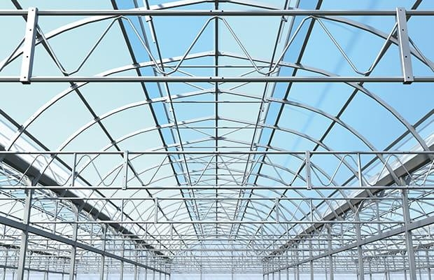 G-Castle ProⅠは、一般社団法人 日本施設園芸協会が推奨する「日本型大型(1ha)標準モデル」に準じ開発した新型ハウスです。大型アーチと水平梁をトラス構造で補強することにより、高軒高でありながらアーチピッチを極限まで広げ、高い採光率を確保しています。大きな空間、高換気効率、高採光性を実現しながら 耐候性も高く、安心かつ高収量が期待できるハウスです。