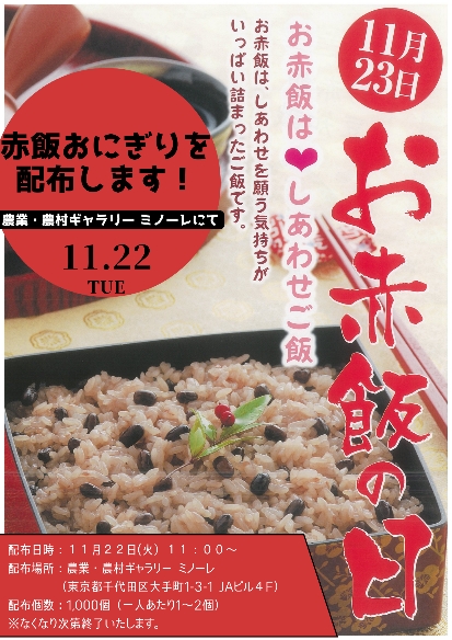 JA全農は、11月23日(水・祝)の“お赤飯の日”にちなんで、11月22日(火)に農業・農村ギャラリー ミノーレ(東京都千代田区)で赤飯おにぎりを配布します。また、11月10日(木)よりツイッターで「国産もち米赤飯セット」のプレゼントキャンペーンも実施しています。