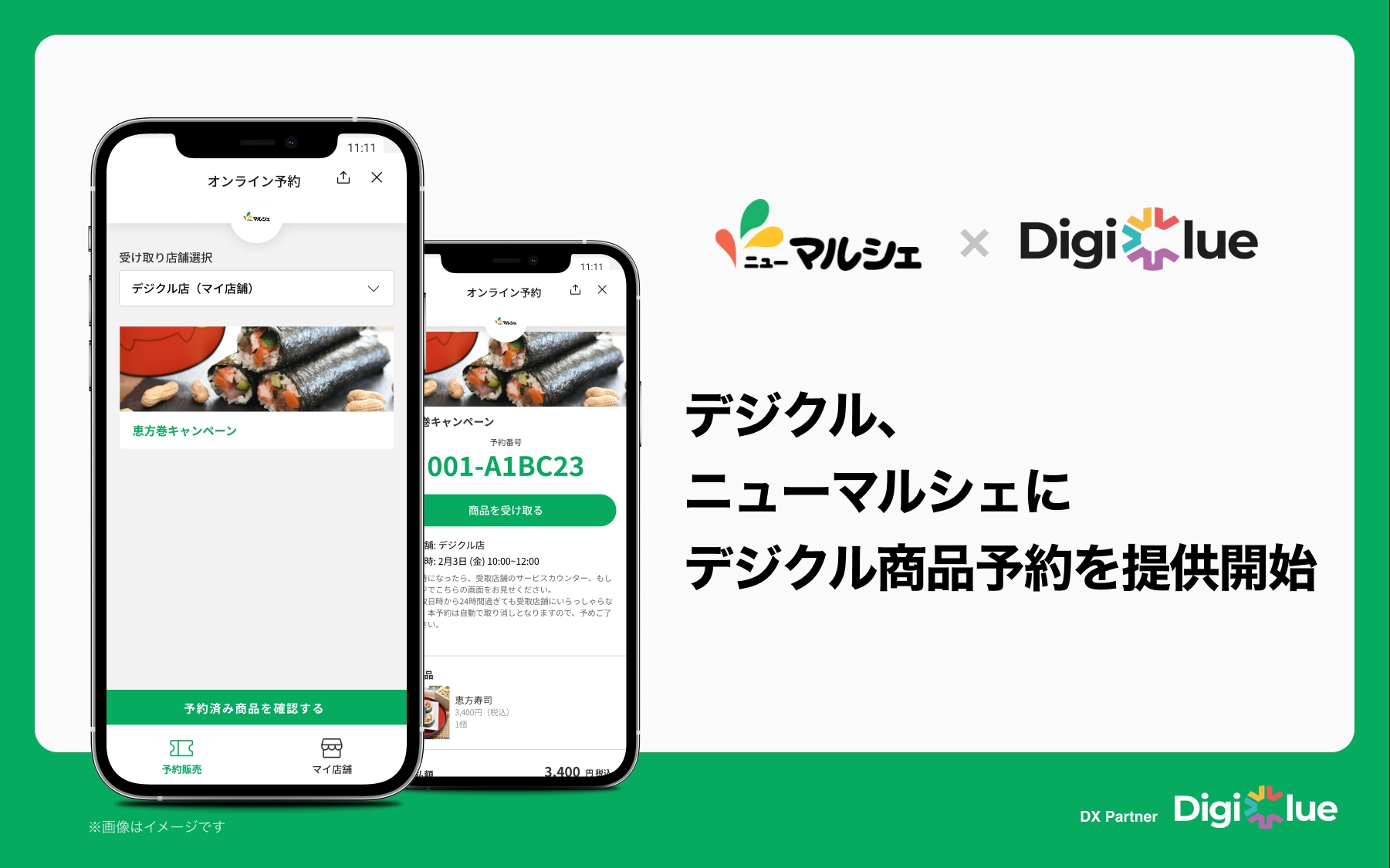 株式会社CARTA HOLDINGSのグループ会社で、小売業のDX(デジタルトランスフォーメーション)支援事業を展開する株式会社デジクル(本社: 東京都渋谷区、代表取締役: 今井 悠介)は、大阪府大阪市で小売スーパー事業を展開する株式会社ニューマルシェ(本社:大阪府大阪市 代表取締役社長:渡邉 敬介)に対して、小売店舗の商品予約業務をLINEで一括管理できるサービス「デジクル商品予約」の提供を開始し、本日よりLINEミニアプリ上で恵方巻きの申し込み受付を開始いたしました。