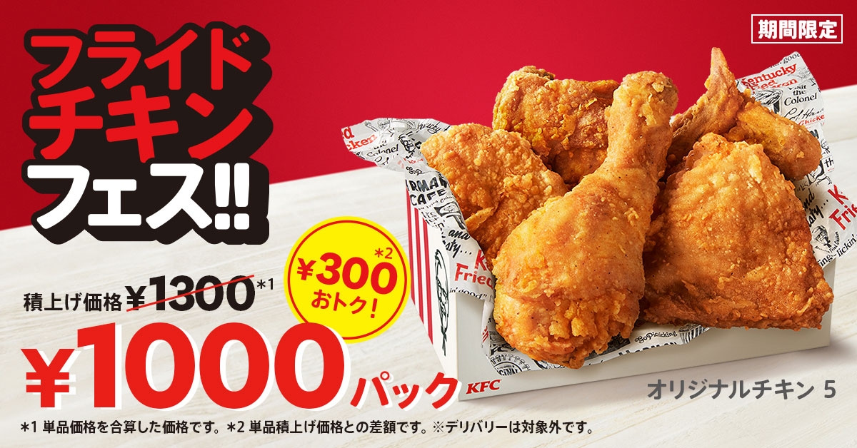 日本KFCホールディングスグループの日本ケンタッキー・フライド・チキン株式会社(社長:判治 孝之、本社:神奈川県横浜市)は、全国のケンタッキーフライドチキン(以下:KFC)店舗でフライドチキンフェスを開催し、「1000円パック」「1500円パック」を11月2日(水)から11月23日(水)までの期間限定で販売します。