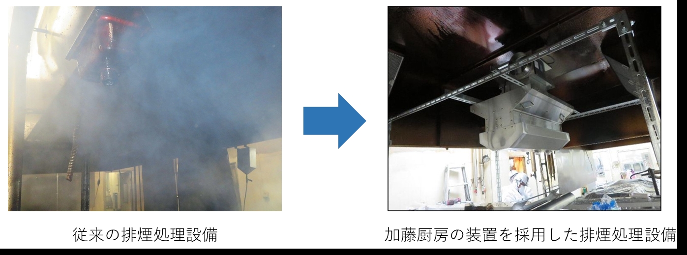 そこで複数の排煙処理装置を調査した結果、水フィルタによる除去方式を選択しました。加藤厨房設備の「ソイルスクラバー」は、その中でも水流でフィルタが汚れにくい仕組みのため他の方式と比較してメンテナンス周期を長期化することができ、保守工数の削減が可能です。