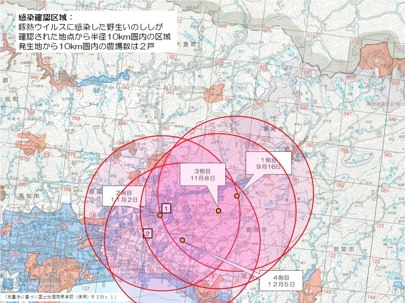 ● 感染確認区域(豚熱ウイルスに感染した野生いのししが確認された地点から半径10km圏内の区域)
