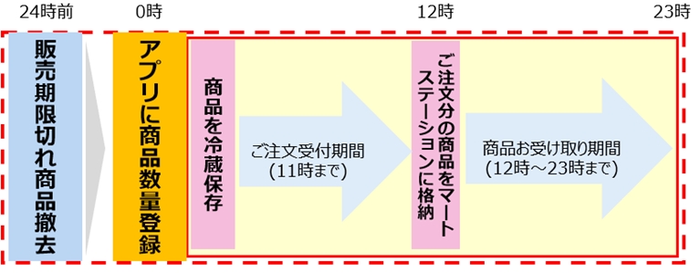 今回の実証実験では、消費期限内ではあるものの通常店頭から撤去する「販売期限切れ」のデザート10品目を値引き販売いたします。販売期限を消費期限当日の午前0時として いる当該デザートを店頭から撤去後、生鮮食品EC「クックパッドマート」の専用アプリに数量を登録し、冷蔵保存します。クックパッドマート会員のお客様からアプリ上で注文・決済が入り次第、同店舗内に設置している、クックパッドマートの商品受け取り用生鮮宅配ボックス「マートステーション」に格納します。その後「マートステーション」からお受け取りいただく仕組みです。