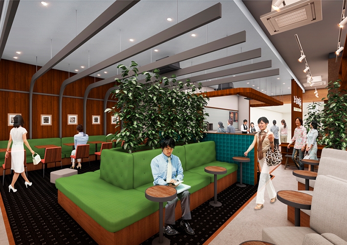 ②オーセンティックゾーン・・・上島珈琲店のアイデンティティを楽しんでいただけるエリアです。壁面にベンチを設け、多くのお客さまにご利用いただけるように設計しています。