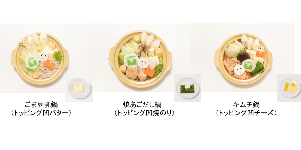 ミツカンの人気鍋メニューでもある、ごま豆乳鍋、焼あごだし鍋、キムチ鍋の3種類をご用意。定番人気の鍋つゆをベースに、オリジナルのロゴ入りかまぼこや、へこみが溶けていく様子を表現した「凹」をかたどったトッピングなど、本イベントでしか食べることができない特製アレンジとなっております。「凹メシ食堂」体験スポット