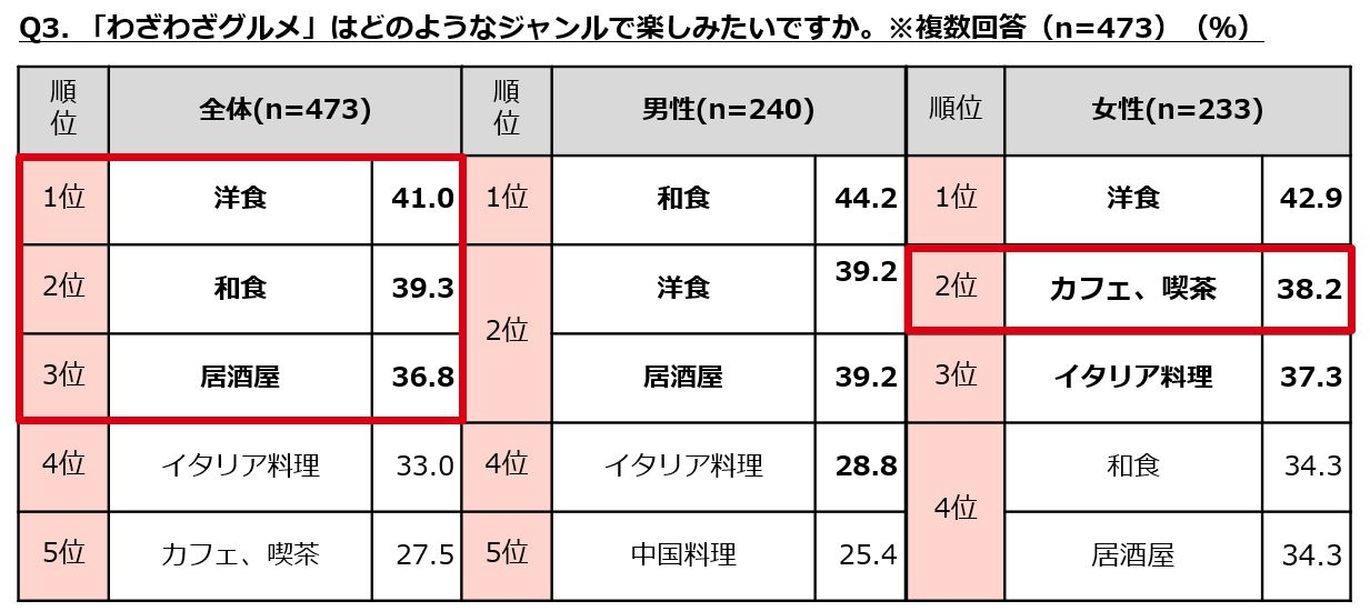 ・楽しみたいジャンルは「洋食」「和食」「居酒屋」がTOP3。女性では「カフェ、喫茶」が2位。