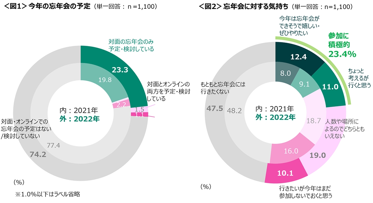 「対面での飲み会を予定・検討している」人は23.3%であり、昨年よりやや増加しているものの、多数は依然として、年の瀬に忘年会の予定や検討はしていない。