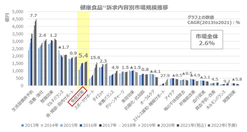 健康食品(サプリメント・食品・飲料)に関する調査※1では、2013年~2021年における健康食品市場全体の年平均成長率が2.6%であることに対し、「免疫対策」市場の年平均成長率は5.4%と高水準を維持しており、2022年以降も継続的な成長が期待されている。