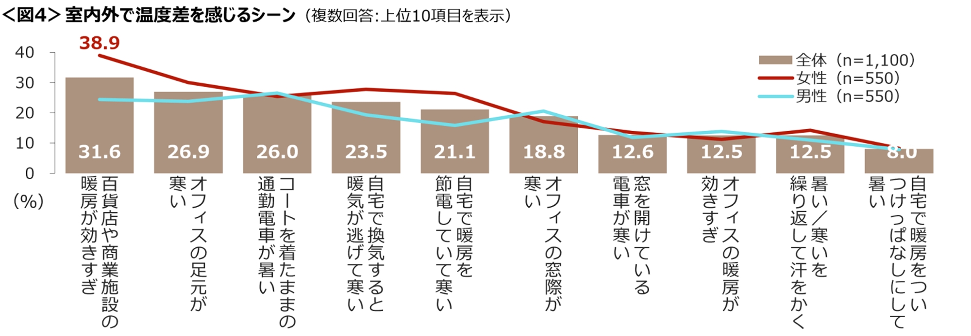 ◆室内外で温度差を感じるのは「百貨店や商業施設の暖房が効きすぎ」が31.6%で最も高い。<図4>