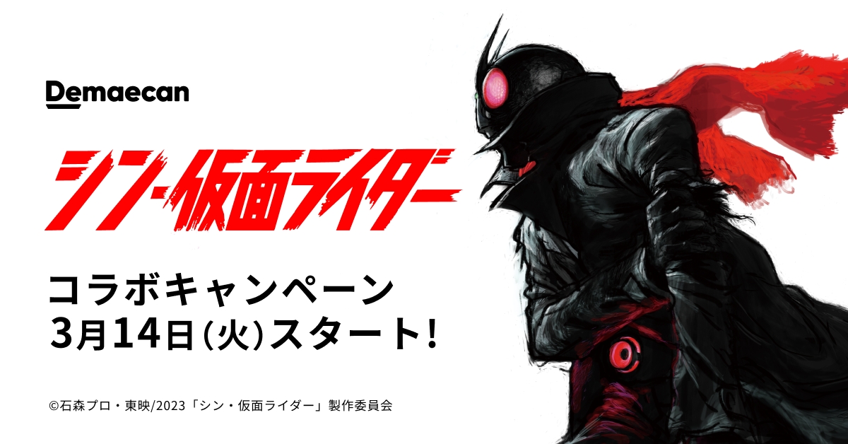 PDF版はこちら (1158KB) 株式会社出前館(本社:東京都渋谷区、代表取締役社長:藤井英雄)が運営する日本最大級のデリバリーサービス『出前館』は、2023年3月17日(金)18時より全国最速公開(一部劇場を除く)、同18日(土)に全国公開される映画『シン・仮面ライダー』((C)石森プロ・東映/2023「シン・仮面ライダー」製作委員会)とコラボしたキャンペーンを2023年3月14日(火)より実施いたします。