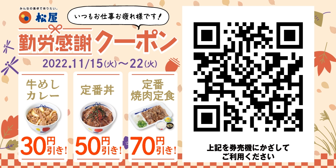 松屋デジタルジャック企画として、2022年11月15日(火)から11月22日(火)まで、牛めし・カレー・定食・その他丼の「松屋」にてご利用可能な「勤労感謝クーポン」を配布いたします。