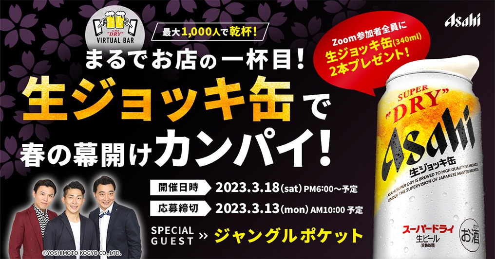「まるでお店の一杯目!生ジョッキ缶で春の幕開けカンパイ!ASAHI SUPER DRY VIRTUAL BAR」は、『アサヒスーパードライ 生ジョッキ缶』で春の幕開けをお祝いするオンラインイベントです。人気お笑いトリオ「ジャングルポケット」の斉藤慎二さん、太田博久さん、おたけさんが参加し、最大1,000名による「生ジョッキ缶」での乾杯や一般のお客さまも参加できるミニゲームの実施などを通じてイベントの盛り上げを図ります。