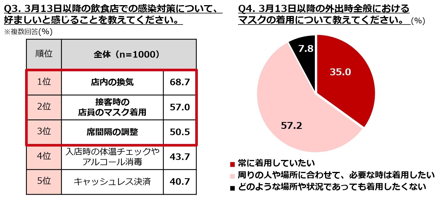 ・好ましい感染対策は「店内の換気」「店員のマスク着用」「席間隔の調整」がTOP3。