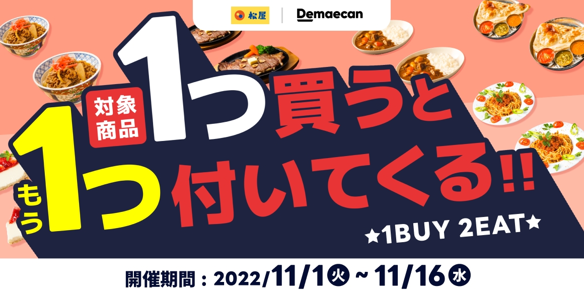 期間中、対象松屋フーズ店舗の「1BUY2EAT」カテゴリ内にある対象商品を購入すると同じ商品が1つ無料になるキャンペーンです。